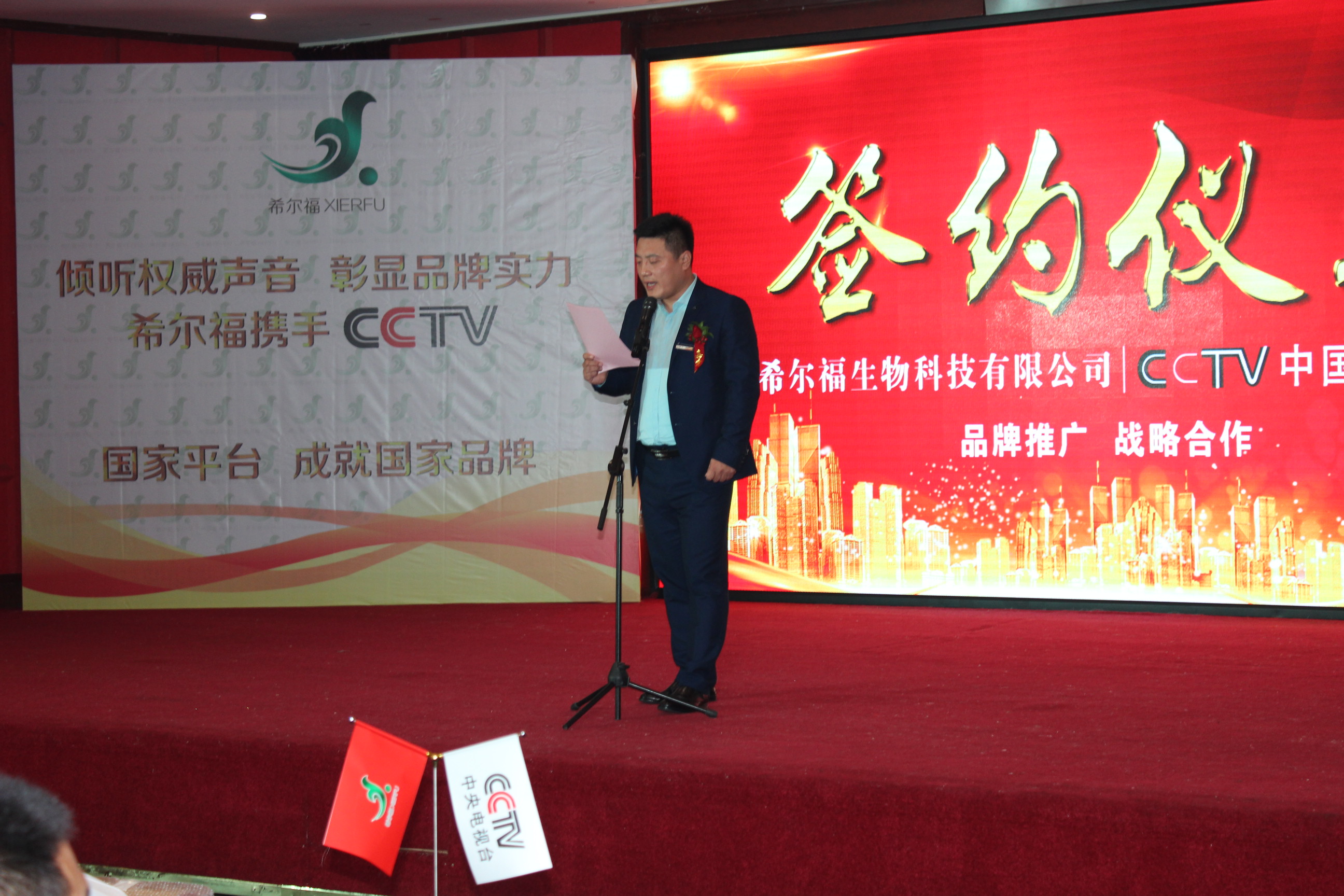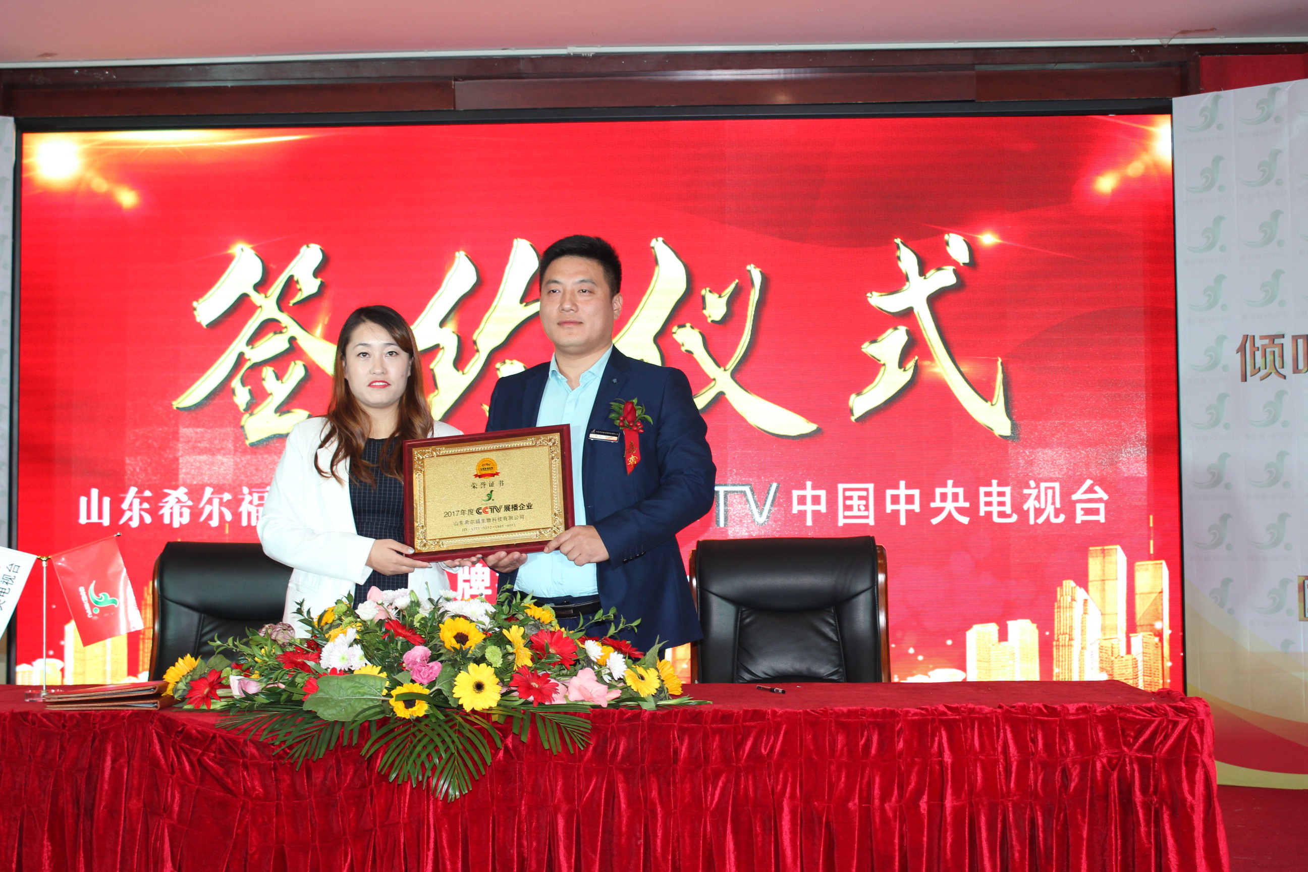 2017年10月26日,山東希爾福生物科技有限公司與CCTV中央電視臺(tái)戰(zhàn)略合作簽約儀式在兗州興隆賓館二樓金色大廳隆重舉行!中央電視臺(tái)駐山東辦事處主任、中央電視臺(tái)證券咨詢欄目《中國(guó)星品牌》制片主任郝小蘭女士親臨現(xiàn)場(chǎng)并致辭。